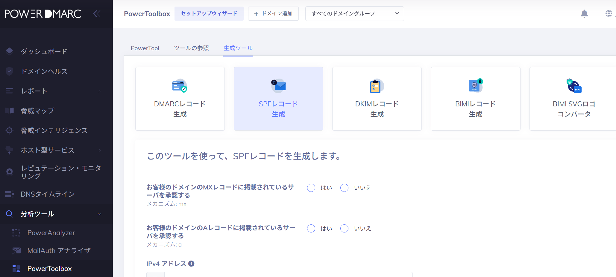 PowerDMARCに無料で登録し、SPFレコードジェネレーターツールを使用してレコードを作成することができます。