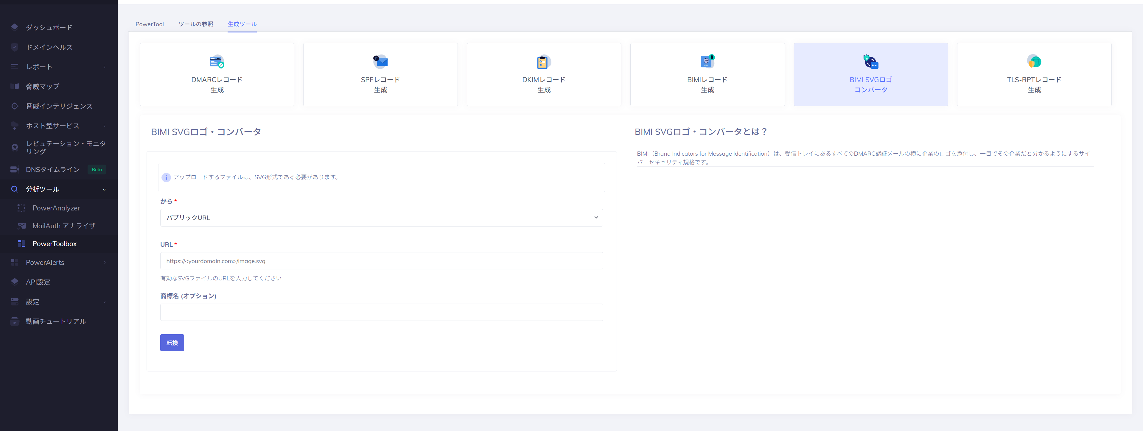 ポータルメニューで「PowerToolbox > BIMI SVG converter」に進み、ロゴをBIMIレコード標準に準拠させましょう。