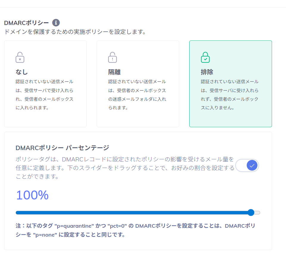 名前の通り、「none」は無行動ポリシーであり、「reject」と「quarantine」は認証されていないメールをそれぞれ拒否または隔離します。