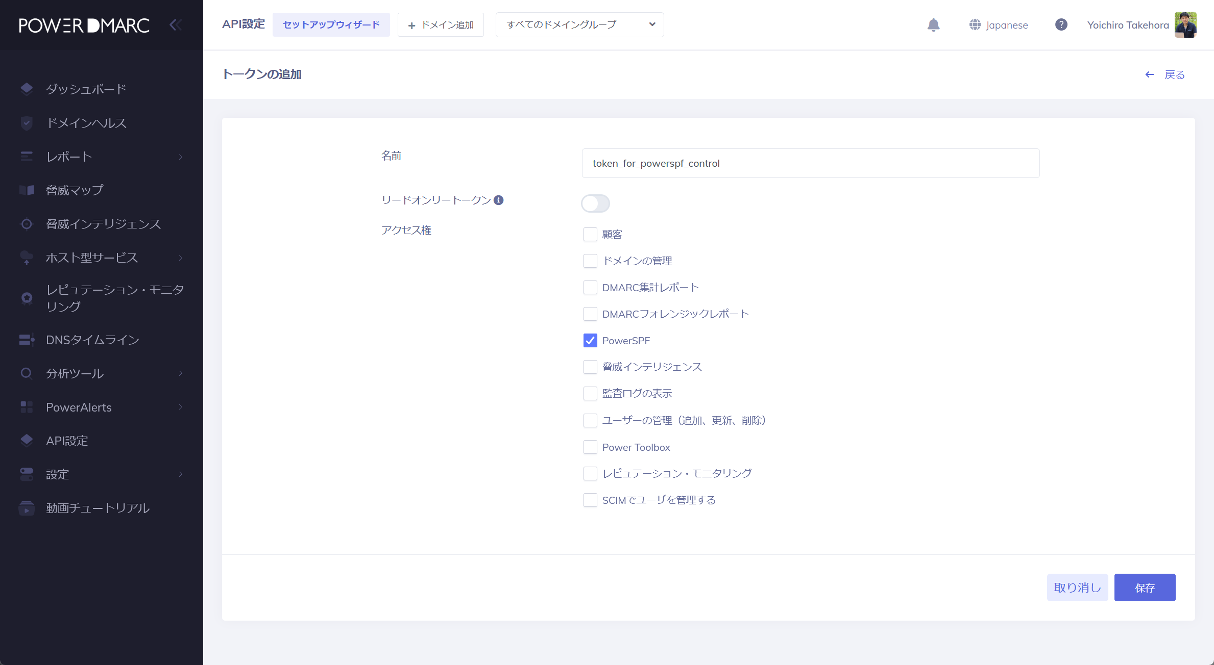 - 名前を入力します。(この例では、api_token_for_control_powerspf)