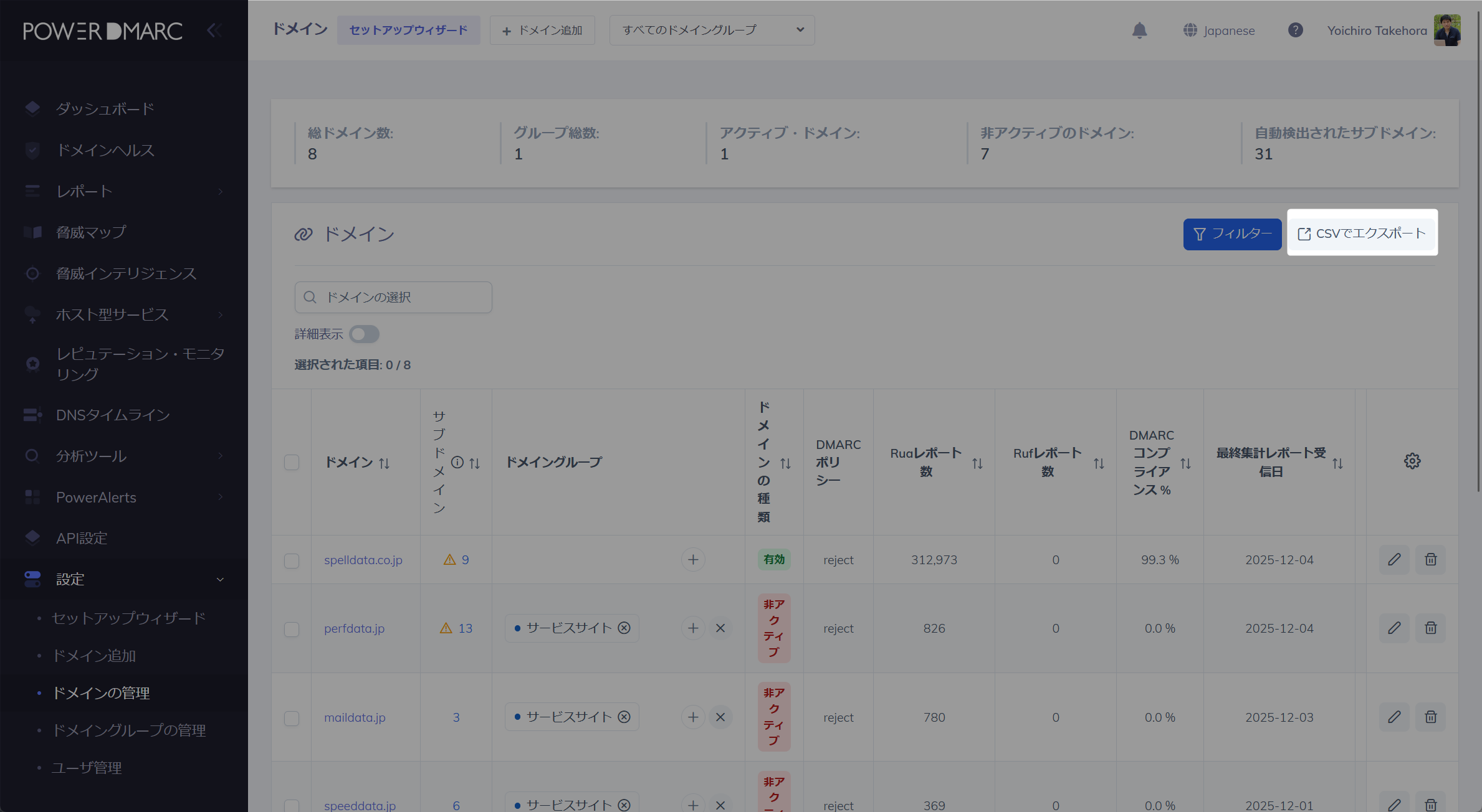 左のメニューの「ドメインの管理」をクリックし、「CSVでエキスポート」のボタンをクリックします。