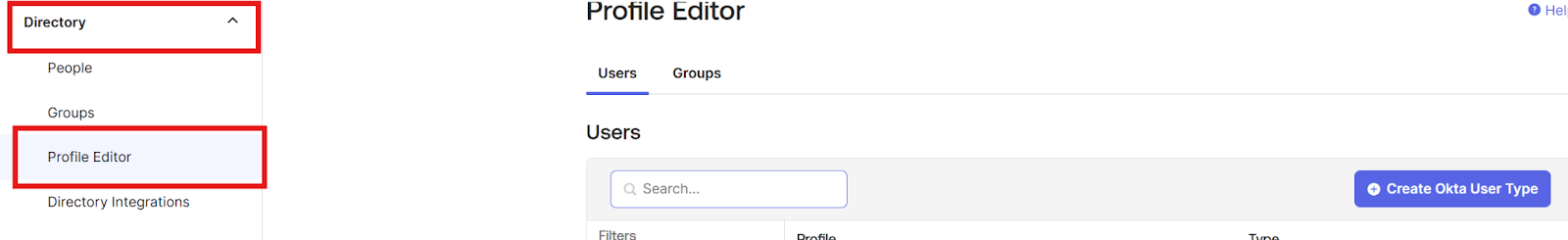 - 左ペインで「Directory」→「Profile Editor」に移動します(パス「/admin/universaldirectory」でもアクセス可能です)。