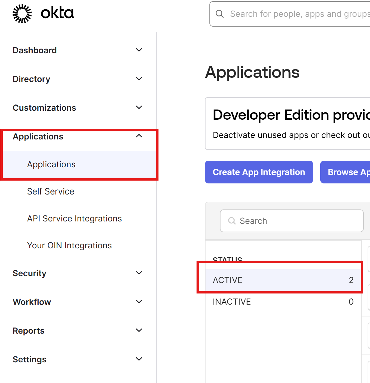 - Oktaアカウントにログインし、「Applications」→「Applications」に移動します。または、OktaプロジェクトのベースURLで以下のパス「/admin/apps/active」にアクセスして、既存のアプリケーション一覧を表示することもできます。