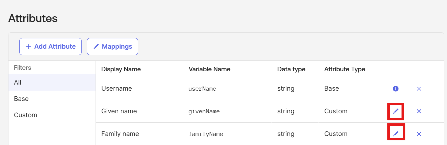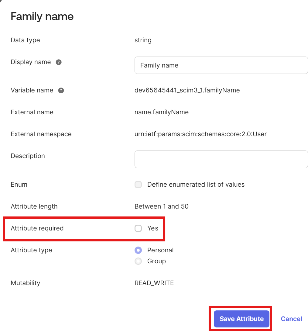 - 「Given Name」と「Family Name」はデフォルトで必須になっています。ペンアイコンをクリックしてこれら2つのレコードを開き、「Attribute Required」チェックボックスをオフにしてから、「Save Attribute」をクリックして変更を保存します。